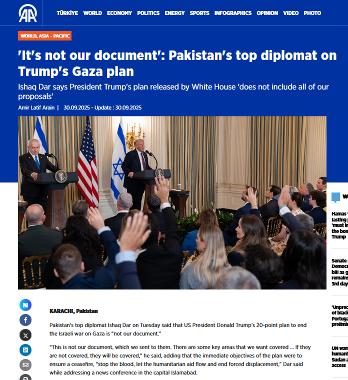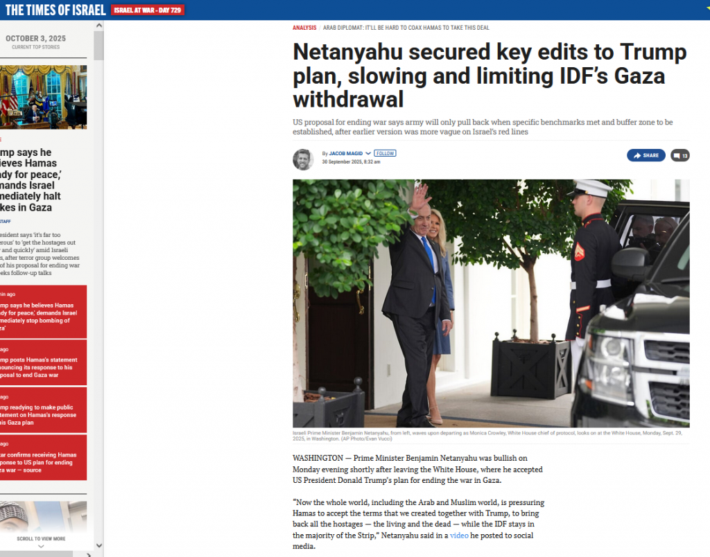 Δευτέρα 6 Οκτώβρη (00.39) >> Την περασμένη βδομάδα παρουσιάσαμε τα βασικά απ’ το «σχέδιο 21 σημείων» που το ψοφιοκουναβιστάν παρουσίασε στα αραβικά και μουσουλμανικά κράτη, ως «σχέδιο ειρήνης στη Γάζα». Σχολιάζαμε ότι αυτά τα 21 σημεία ταίριαζαν περισσότερο στους προσανατολισμούς διάφορων αραβικών πετροδικτατοριών παρά στα σχέδια του θεοναζί, απαρτχάιντ καθεστώτος∙ και ότι, άρα, με τον έναν ή τον άλλο τρόπο, οι χασάπηδες θα το απέρριπταν.