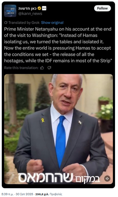 Κάναμε ένα μικρό λάθος, λόγω άγνοιας: εκείνο το «σχέδιο 21 σημείων» δεν έφτασε ποτέ στους χασάπηδες! Όταν ο αρχηγός τους πήγε στην Ουάσιγκτον διαμορφώθηκε ένα άλλο σχέδιο, «20 σημείων» αυτό, τροποποιώντας το προηγούμενο κατά τα συμφέροντα των θεοναζί. Και, φυσικά, ο αρχιχασάπης «ανακοίνωσε ότι το δέχεται». Στα λόγια (περιμένοντας ότι η Παλαιστινιακή αντίσταση θα το απορρίψει…)