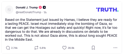 Όλα τα δυτικά κράτη / παρακράτη (συμπεριλαμβανόμενου του ελλαδιστάν) ανακοίνωσαν το ίδιο. Κτύπησαν παλαμάκια για το «σχέδιο»… Χωρίς καν να το ξέρουν – τους ήταν αρκετό που συμφωνούσε ο αρχιχασάπης και το ψοφιοκουναβιστάν… Έμοιαζε «σατανική κίνηση» – απ’ την μεριά τους κατά της Παλαιστινιακής αντίστασης: «σας κάνουμε μια πρόταση που δεν μπορείτε να αρνηθείτε…»