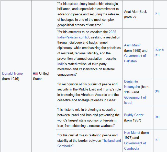 Η υποψηφιότητα του ψόφιου κουναβιού για το φετεινό «νόμπελ ειρήνης» και η υποστήριξή της – από Wikipedia μεριά. Στη λίστα των 338 (!!!) υποψηφίων υπάρχει όμως μια πολύ πιο ενδιαφέρουσα: της Francesca Albanese! Θα καταδεχόταν άραγε το ψόφιο κουνάβι να μοιραστεί το βραβείο με την Albanese; Αν η νορβηγική «επιτροπή» έχει χιούμορ (μαύρο, κατάμαυρο!) θα πρέπει να δοκιμάσει τις ψοφιοκουναβικές αντοχές – στην ηλικία του!