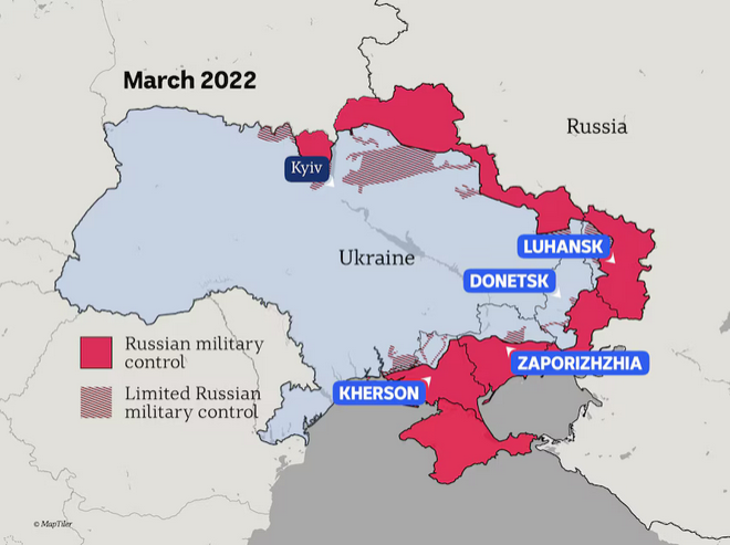 Αυτή στον πάνω χάρτη ήταν η κατάσταση στο τέλος Μάρτη του 2022: με σχετικά λίγες δυνάμεις (περίπου 120.000 έναντι διπλάσιου ή τριπλάσιου ουκρανικού στρατού πλήρως εξοπλισμένου και εκπαιδευμένου απ’ την δύση…) η Μόσχα είχε φέρει τον Zelensky ως πολιτικό αφεντικό της Ουκρανίας σ’ εκείνο το σημείο όπου διαπραγματευόμενος και συμφωνώντας θα μπορούσε να «απαντήσει» στο φασισταριό (του) χωρίς να θεωρηθεί προδότης…