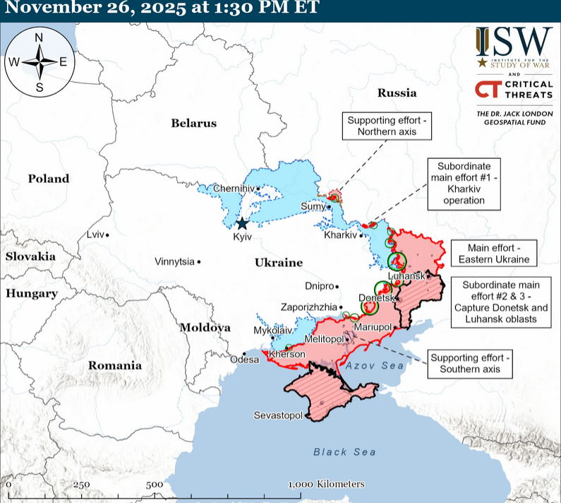 Χάρτης με την κατάσταση στο έδαφος στις 26 Νοέμβρη 2025 (αλλάζει κάθε μέρα). Το μπλε ήταν η κατάσταση στα τέλη Μάρτη του 2022 – δεν την δείχνει όμως σωστά στα νότια και νοτιοανατολικά (θα πρέπει να κάνετε σύγκριση με τον χάρτη πιο πάνω). Η εδαφική διαφορά που φαίνεται ονομάστηκε απ’ την δυτική προπαγάνδα “υποχώρηση” του ρωσικού στρατού, και απόδειξη της αδυναμίας του…