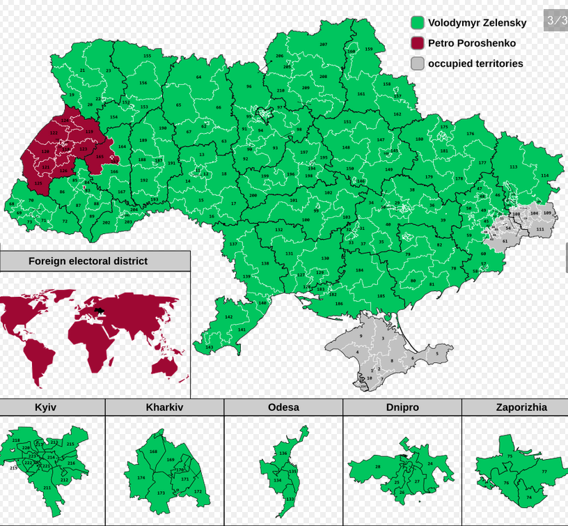 Η προ πολλού τελειωμένη προεδρική θητεία του τοξικού του Κιέβου ξεκίνησε αλλιώς. Στον δεύτερο γύρο των ουκρανικών προεδρικών εκλογών το 2019 ο θεατρίνος, ρωσόφωνος (και ήδη τοξικός) Zelensky, μ’ ένα πρόγραμμα που μεταξύ άλλων υποσχόταν διάλογο και συνεννόηση με τη Μόσχα (!!!) συνέτριψε τον αντίπαλό του σκληροπυρηνικό ακροδεξιό Poroshenko λαμβάνοντας το 73% των ψήφων, νικώντας σχεδόν σ’ όλες τις εκλογικές περιφέρειες – εκτός απ’ την γνωστή φασιστικοκρατούμενη ζώνη στο Lviv και στα πέριξ: