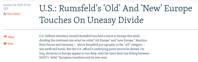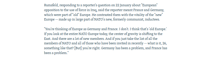 Ακολούθησαν κάποιες αναλαμπές της γερμανικής (και της γαλλικής) προσπάθειας για «γεωπολιτική χειραφέτηση» απ’ την Ουάσιγκτον. Όπως, ας πούμε, το 2003, όταν Βερολίνο και Παρίσι αρνήθηκαν την συμμετοχή στη «συμμαχία των προθύμων» για την εισβολή στο ιράκ. Για να βαφτιστούν απ’ το γεράκι υπ.αμ. του Μπους του Β Donald Rumsfeld «γερασμένη (δηλαδή παρακμιακή) ευρώπη» σε σχέση με την ανθηρή «νέα ευρώπη», τα κράτη του πρώην ανατολικού μπλοκ, που έδειξαν την δέουσα προθυμία για την «παρέλαση» (όπως νόμιζαν) στην Μεσοποταμία, την εισβολή και κατοχή του ιράκ.