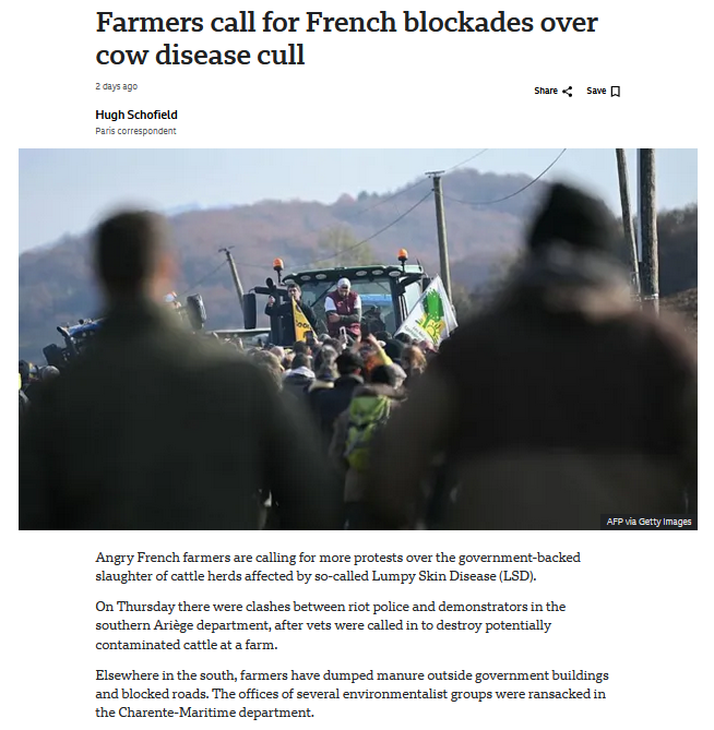 Αυτοί είναι γάλλοι στην Προβηγκία (επάνω φωτο) – τώρα. Το πανό τους λέει «το τέλος μας θα είναι η πείνα σας». Mιας και ο εναντίον τους μοχλός εκεί δεν είναι το «σκάνδαλο του οπεκεπε» έχουν μια διαυγέστερη αντίληψη του τι συμβαίνει: διότι εκεί δεν σφάζουν κατά χιλιάδες πρόβατα λόγω … μιας αρρώστιας. Σφάζουν μοσχάρια λόγω … μιας αρρώστιας….