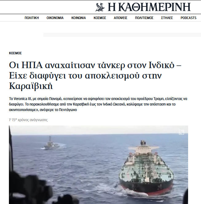 Δευτέρα 16 Φλεβάρη (00.04) >> Τα διεθνή ύδατα δεν είναι άβατο. Από ξηράς, αέρος ή θαλάσσης θα σας βρούμε και θα σας οδηγήσουμε στη δικαιοσύνη. Τάδε έφη το αμερικανικό «πεντάγωνο» ή το αρμόδιο υπουργείο πολέμου μετά το ρεσάλτο και την κατάσχεση ενός δεύτερου δεξαμενόπλοιου μέσα σε δυο βδομάδες… Πού; Όχι στην Καραϊβική… Αλλά στο ινδικό! Τι είχαν κάνει τα καταραμένα; Είχαν φύγει απ’ τη βενεζουέλα μεταφέροντας πετρέλαιο στην κίνα, και «αψήφησαν τον ναυτικό αποπλεισμό διαφεύγοντας»…
