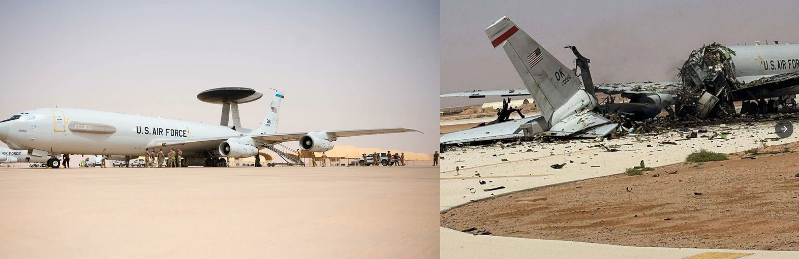 Αριστερά είναι ένα αμερικανικό «ιπτάμενο ραντάρ» (awacs) παρκαρισμένο καμαρωτό καμαρωτό. Δεξιά είναι το χάλι του μετά από την επίσκεψη ενός ιρανικού πυραύλου στην σαουδαραβική βάση Prince Sultan, κάπου στην έρημο. (Δεν ήταν μόνο το awacs που κτυπήθηκε στη συγκεκριμένη αντεπίθεση).