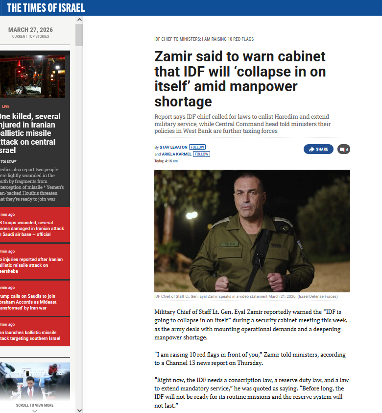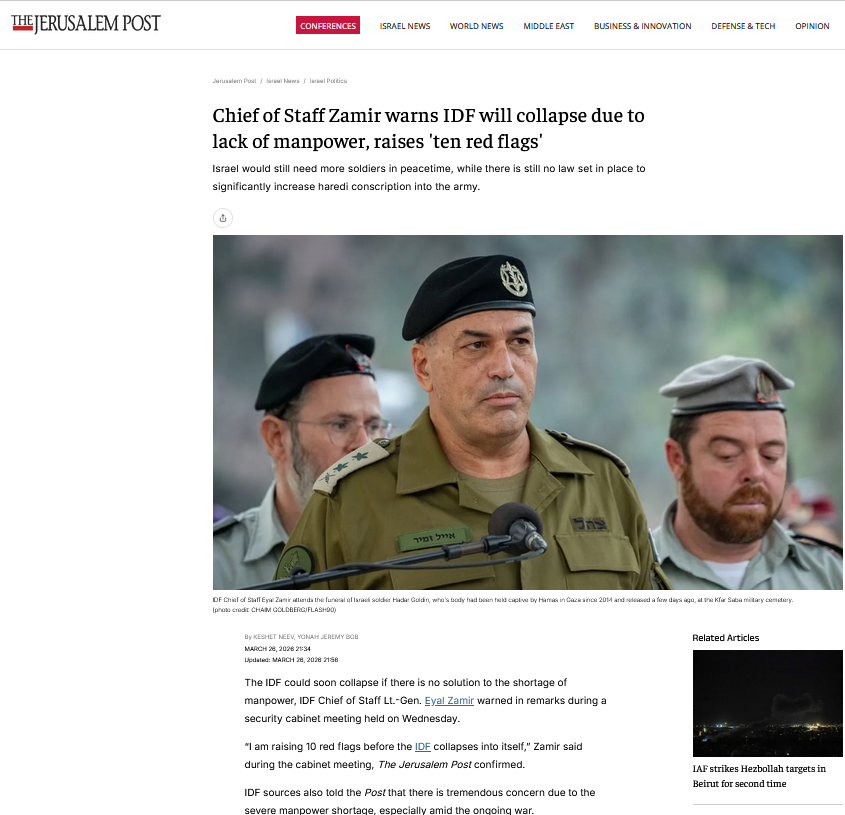 Οι δραματικές προειδοποιήσεις του επιτελείου (φωτο στην αρχή) μπορεί να είναι κάπως υπερβολικές. Αλλά το πρόβλημα είναι παραπάνω από πραγματικό: το θεοναζί, απαρτχάιντ καθεστώς έχει μεγάλο φασιστικό πλεόνασμα, αλλά σοβαρό έλλειμμα σε κεφάλια που θα έπεφταν σε πραγματικές μάχες. Το φασισταριό των εποίκων, ειδικά στη Δυτική Όχθη, απολαμβάνει να επιτίθεται σε άοπλους Παλαιστίνιους, έχοντας μαζί του τον στρατό και την στρατοαστυνομία∙ αλλά σε γενικές γραμμές θέλει δολοφονικές «εκδρομές», όχι να «θυσιαστεί»…