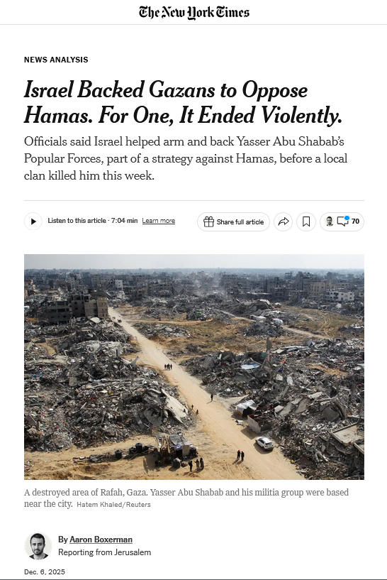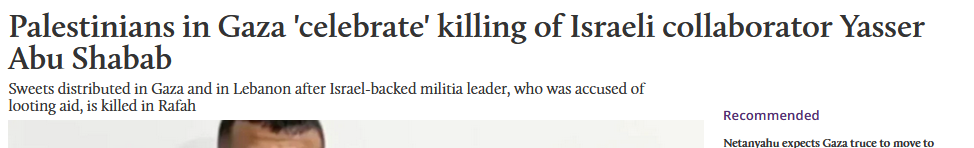 Δευτέρα 8 Δεκέμβρη (00.39) >> Ήταν δίκαιο, και έγινε: ένα κάθαρμα, ένας προδότης ονόματι Yasser Abu Shabab, εγκατέλειψε τον μάταιο τούτο κόσμο πριν 4 ημέρες – και η Γάζα ξεβρώμισε.